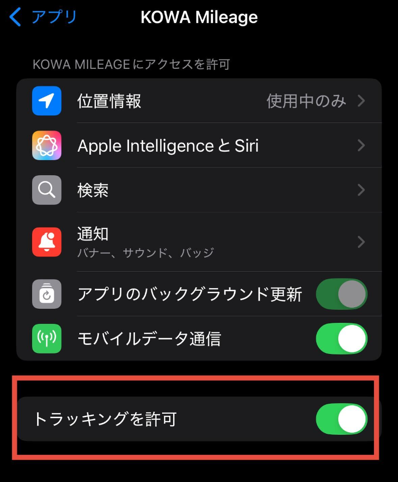 iPhoneの「設定」 より、「アプリ」>「KOWA Mileage 」に遷移し、『トラッキングを許可』をONにしてください。